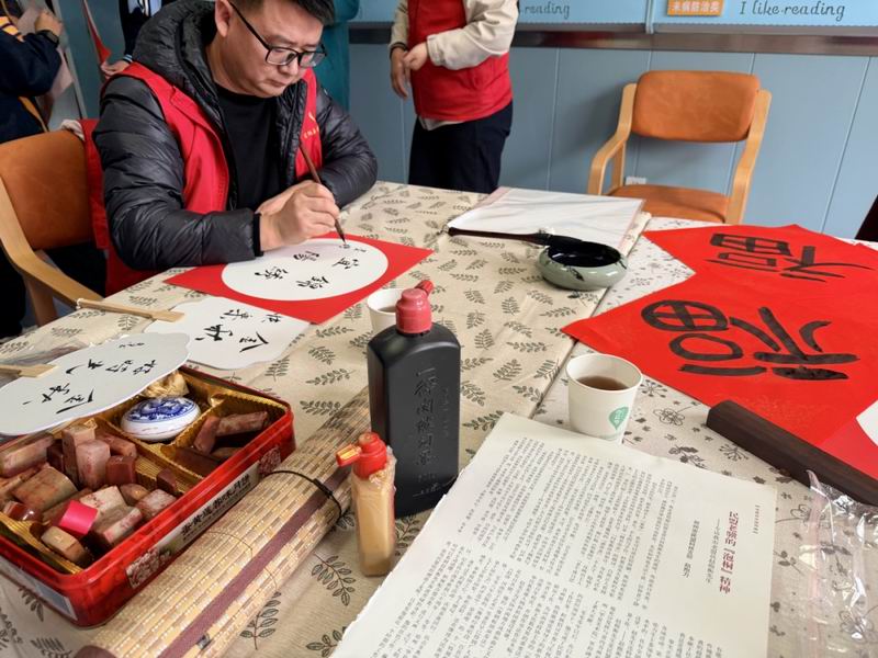 书法爱好者挥毫泼墨,一幅幅“福寿康宁”的书法作品递到老人手中。