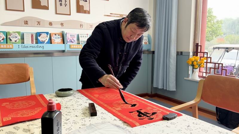 书法爱好者挥毫泼墨,一幅幅“福寿康宁”的书法作品递到老人手中。