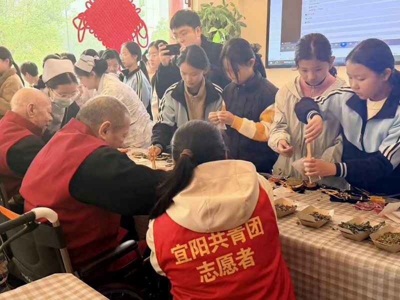 灵山小学的孩子们则与老人携手制作香包,五彩的布料、馨香的药草在指尖翻飞,一老一小的欢声笑语打破代际隔阂,勾勒出温馨和谐的画面。